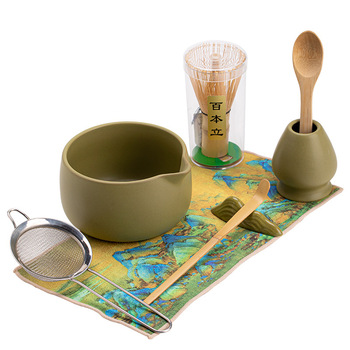 طقم خفاقة ماتشا مع وعاء سيراميك بفوهة صب، وعاء سيراميك تقليدي ياباني، خفاقة بامبو بـ 100 شوكة، طقم ماتشا سيراميك